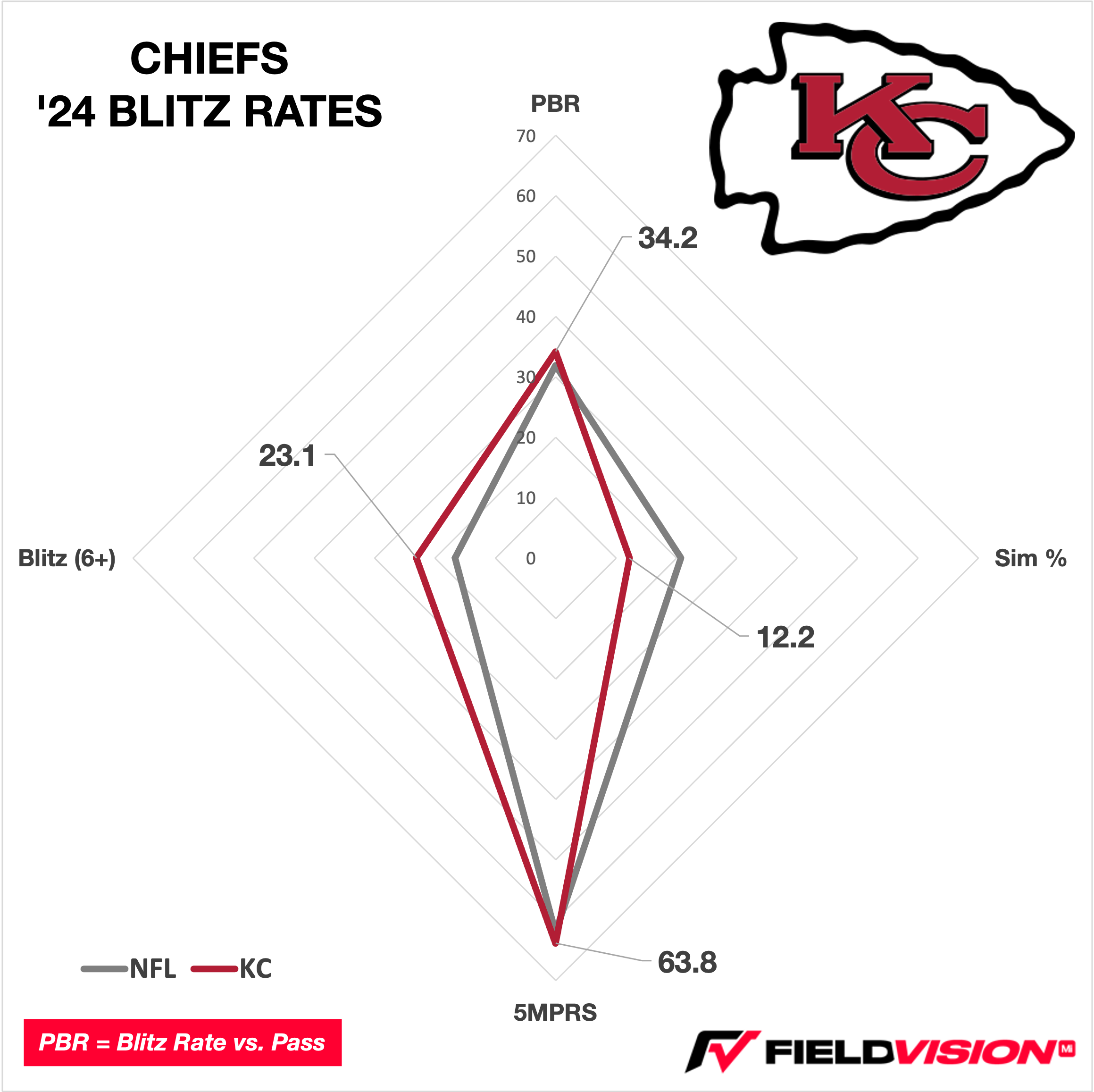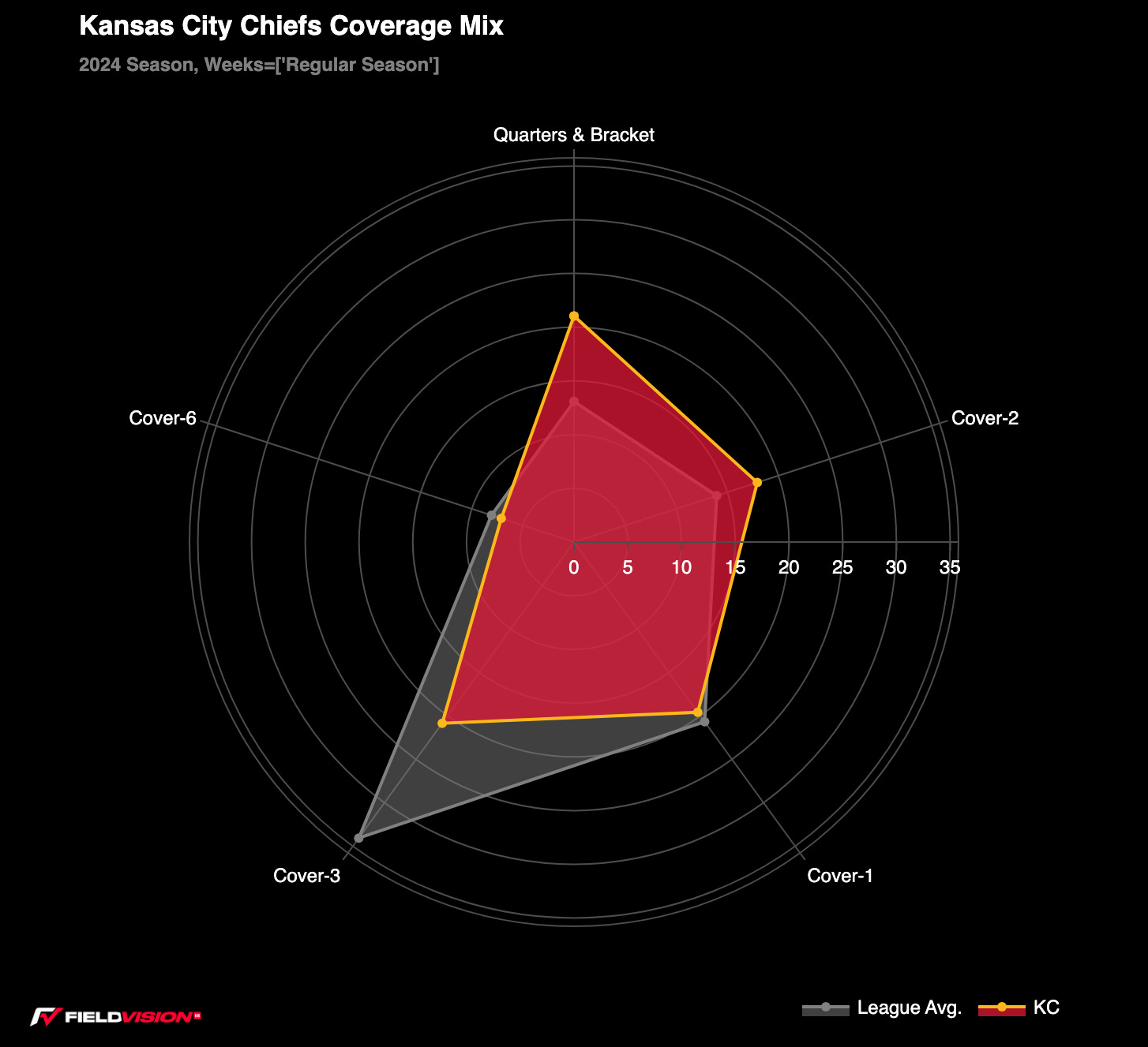 Kansas City is unique in the way it calls its coverages. Under Spags, the defense has been at the top of the charts regarding split-field coverage usage. In 2024, the Chiefs finished third in middle-of-the-field open (MOFO) coverages (49.2%). Quarters (or Palms) has always been a feature of the defense, and they finished second in the league last year in usage. They finished sixth in Cover 2 usage.