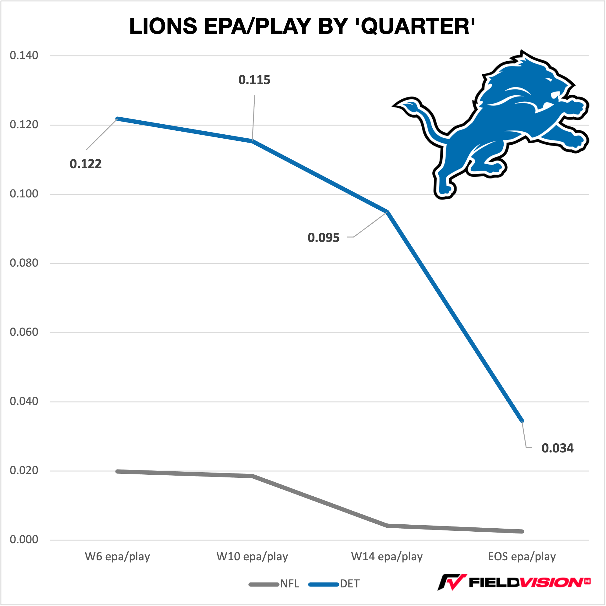Defensively, after Week 6, the Lions were seventh in EPA/play. By Week 10, they had climbed to fourth, even with a dip in overall production. Then attrition finally hit.