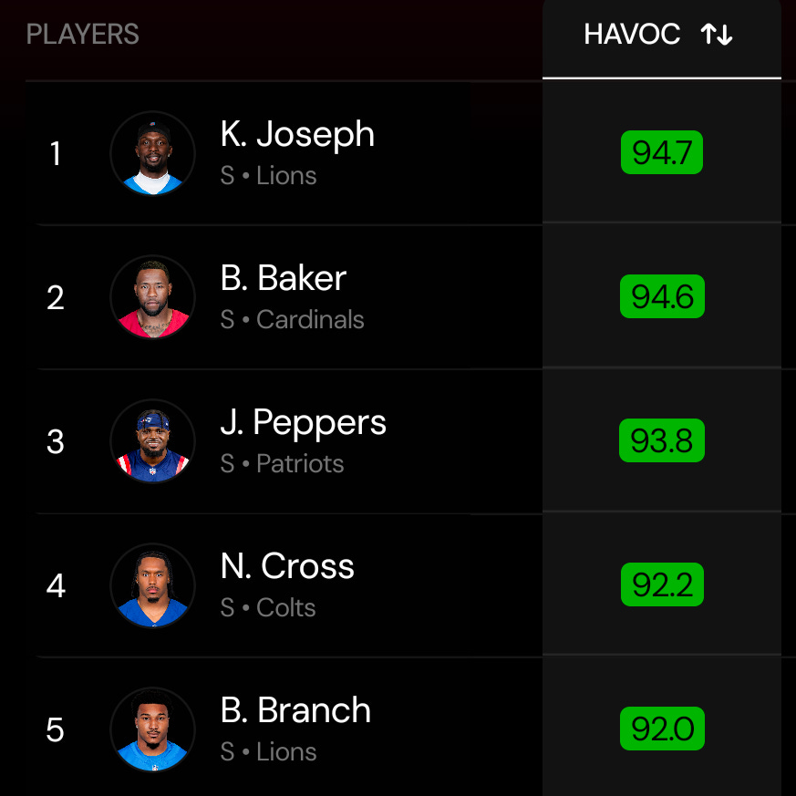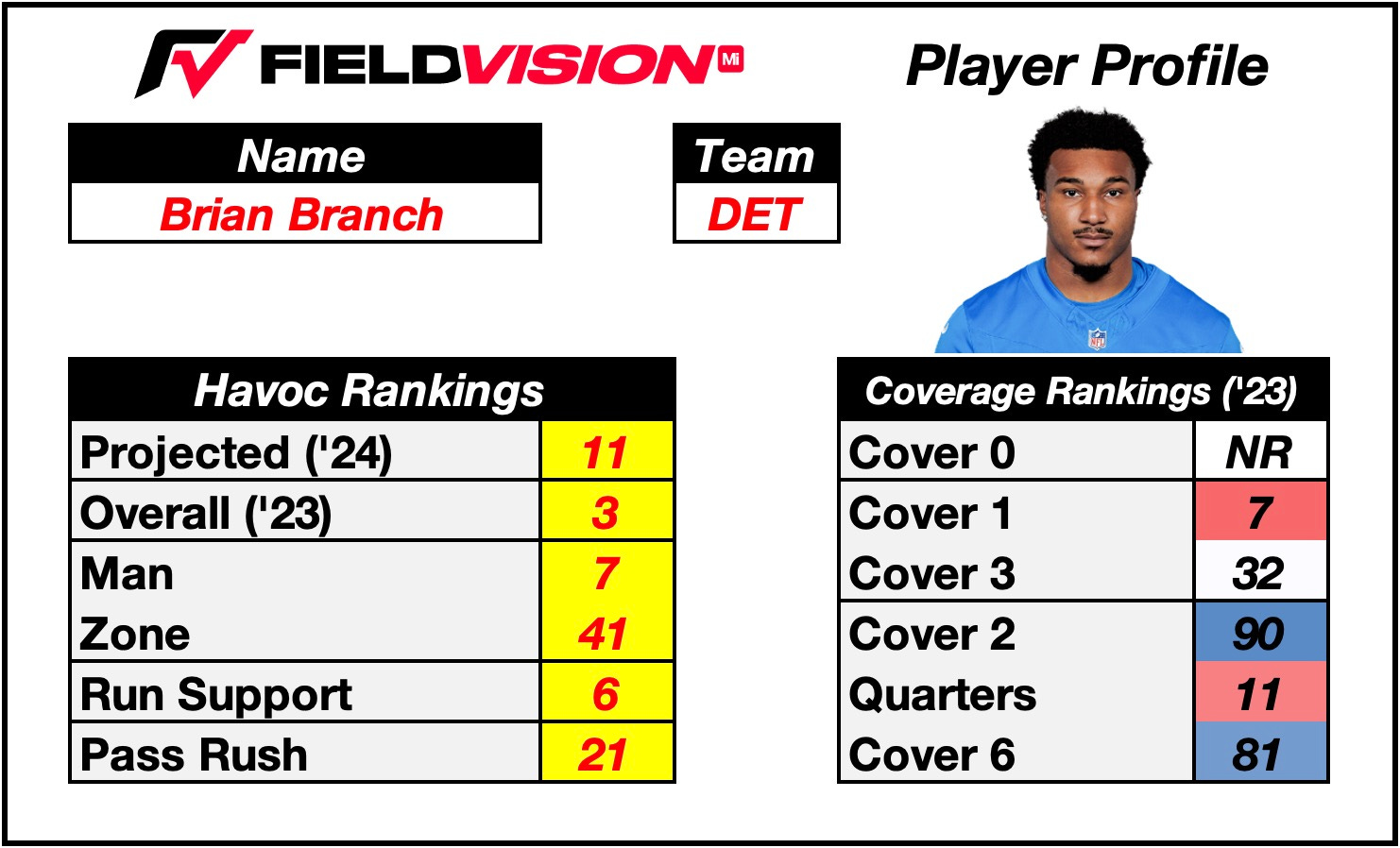 With Branch at Safety, Glenn could still use him as a man coverage defender as the primary ‘Down’ Safety. Kirby Joseph would play the post, and newly acquired Carlton Davis and rookie Terrion Arnold would play man coverage outside. The tandem of Kirby and Branch has proven to be one of the best Safety duos in the NFL (above). Field Vision’s Havoc Ratings has both Lions’ Safeties in the top 25; only the Bears boast a duo in the top 15 (Byrad and Brisker).