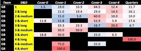 Through five weeks, Hafley’s coverage usage is almost identical to that of his counterparts outside Cover 2 (Tampa) and Cover 6. The other members of this tree prefer to run Quarters over the other split-field concepts. Under new Head Coach Jeff Ulbrich, only the Jets run Cover 6 at the same rate.