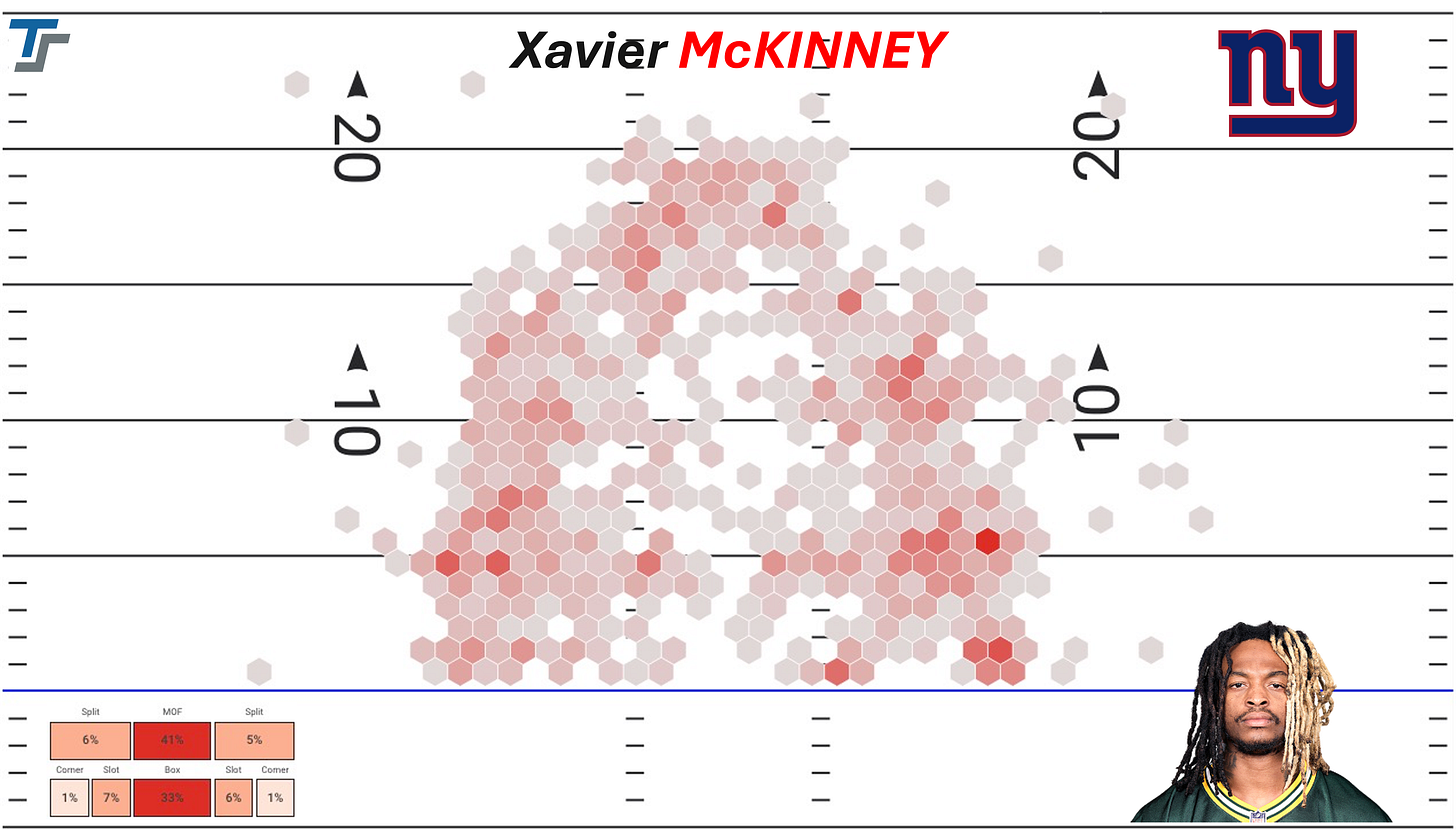 Under former defensive coordinator Wink Martindale, Safety Xavier McKinney aligned almost anywhere. His ‘box’ usage rate was 33%, and Slot usage was 13%. Field Vision’s Havoc Ratings had McKinney as the fourth-best Safety in 2023. Martindale used McKinney as a tool, moving him around the offense and even sending him on pressures.