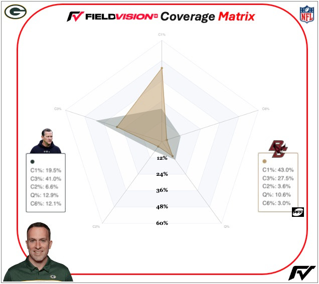 In Boston, Hafley ran a majority Cover 1 and minimal split-field coverages. Projecting what he would run was difficult because his situation as the head coach at Boston College would be much different than in Green Bay. Most pundits, including myself, figured he would carry a more aggressive style of play than his counterparts in New York (Ulbrich), Houston (Ryans), and Sorensen (San Fransisco).
