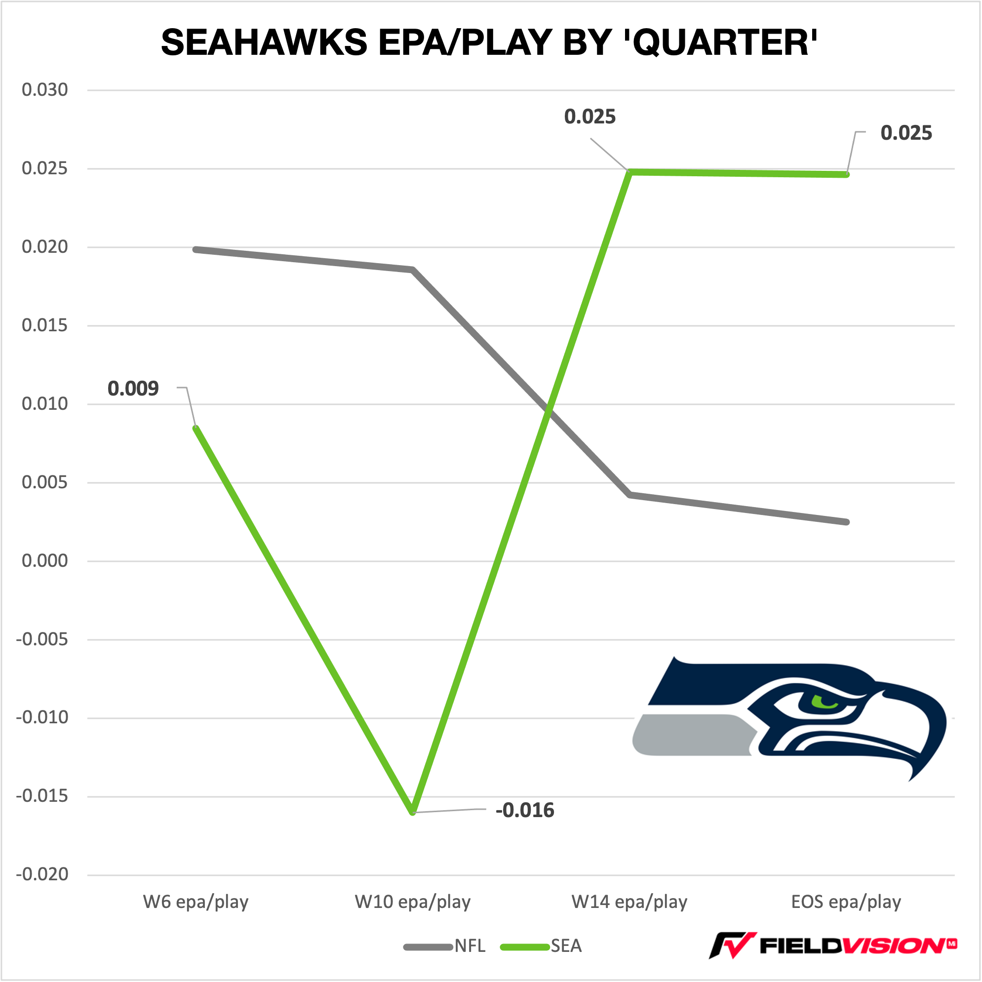 Defensively, it took half the year, but the Seahawks found their groove under Macdonald and finished a respectable 11th in EPA/play. From Week 10 to Week 14 (3rd Quarter of the season), the Seahawks had the third-highest rise in EPA/play (.041) in the NFL, taking them from 20th in EPA to 11th, where they would finish the year. FTN’s DVOA had them finishing 10th.