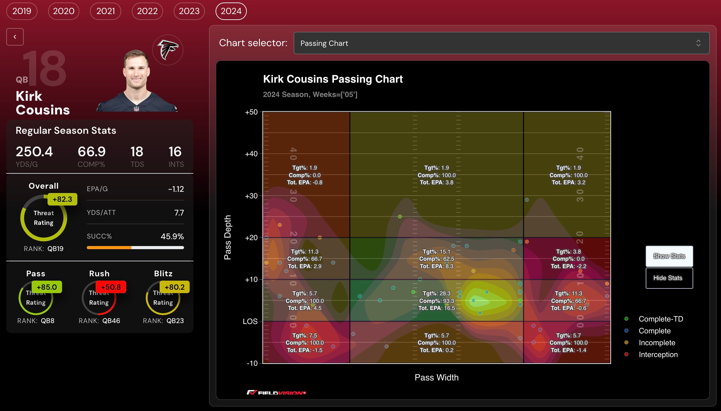 Coverage ability in the middle part of the defense, primarily in the seams, was the main culprit for the lack of success against the pass. A game that defined this issue was the Week 5 overtime loss to divisional rival Atlanta. In that game, Kirk Cousins threw for over 500 yards, four touchdowns, and only one interception. Above, his heat map illustrates that most of his throws went to the lower-middle zones or where the linebackers should have been in coverage.
