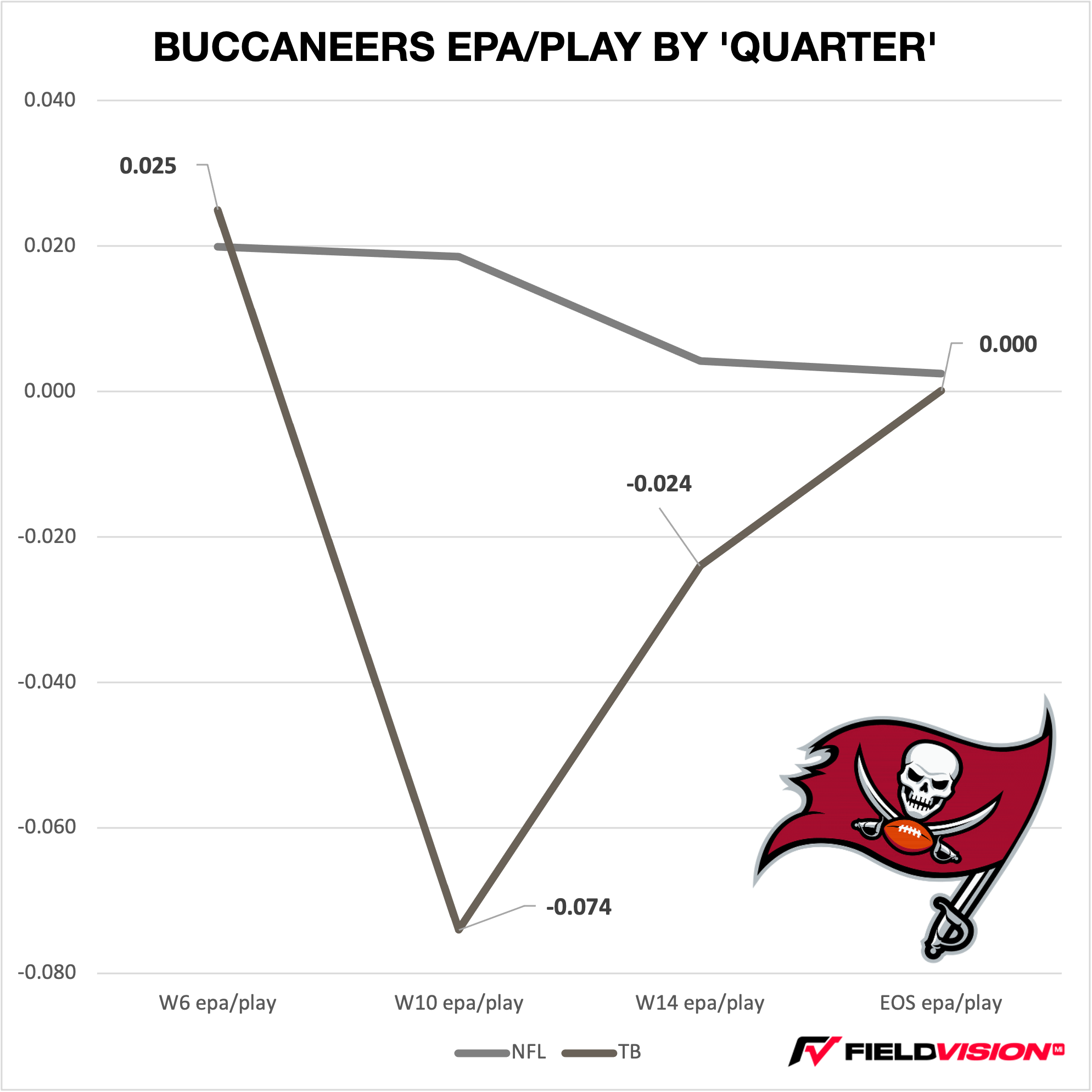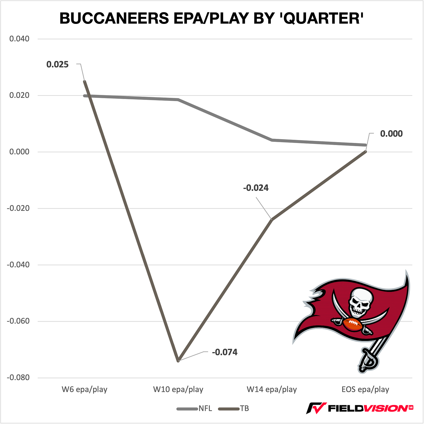 Following the Week 5 loss to the Falcons, the defense cratered. By Week 10, it had gone from 16th in EPA/play to 29th. Only the Tennessee Titans had a more significant drop in that ‘quarter’ of the season. Todd Bowles' offense was firing on all cylinders, while his defense was sputtering. Liam Coen parlayed that offensive success into the head coaching position in Jacksonville. Bowles has now produced two offensive head coaches in the past two seasons.