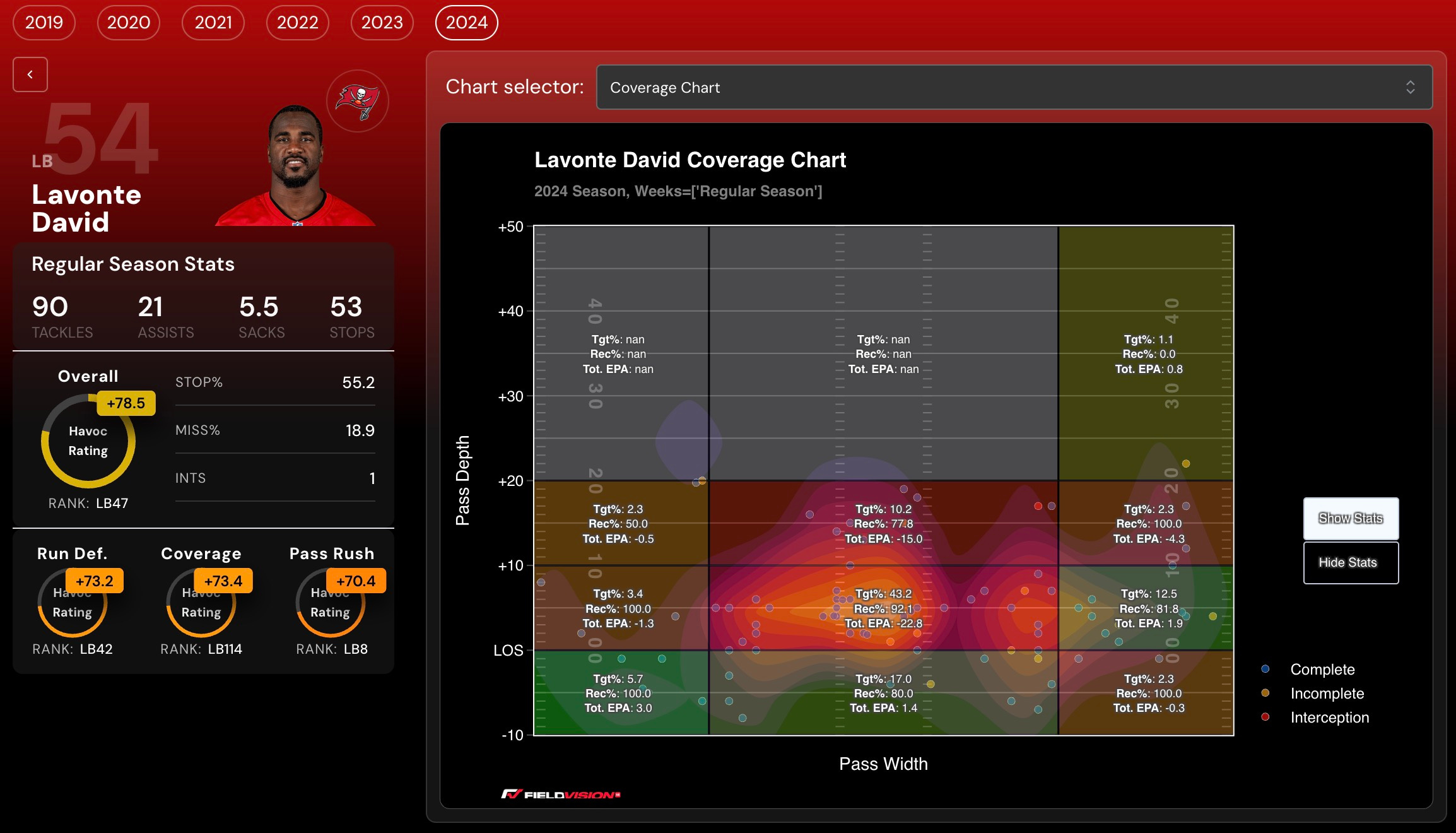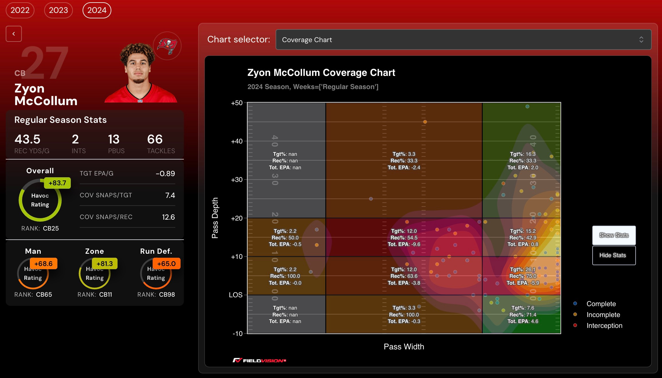 That much pressure on offenses stresses the defense's back end. For the most part, the corners held up. According to Field Vision's Havoc Ratings, Cornerback Zyon McCullom was a top-25 CB in production this past season. His primary partner, Jamel Dean, finished 32nd. Both played exceptionally well in zone, with Dean finishing as the #2 CB zone in Havoc, though he did struggle in man coverage.
