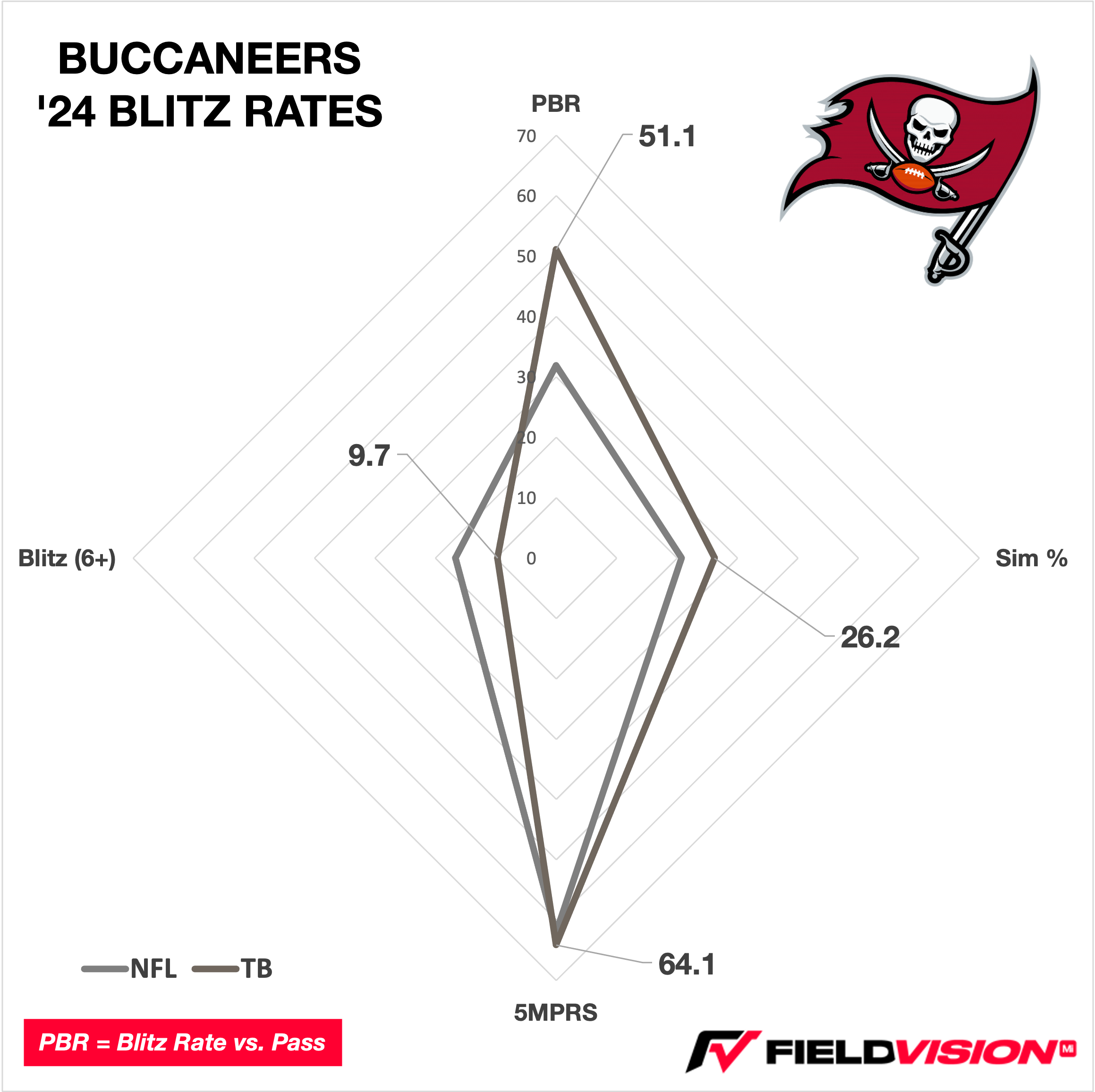 The NFL has three outliers regarding pressure: Brian Flores (Vikings), Todd Bowles, and Vance Joseph (Broncos). In 2024, only two teams blitzed on more than 40% of their downs: the Vikings and the Buccaneers. On early downs (1st/2nd), only three teams had a blitz rate higher than 40%: the Vikings, the Buccaneers, and the Broncos. The next closest team, the Panthers, only blitzed on 32% of their early downs.