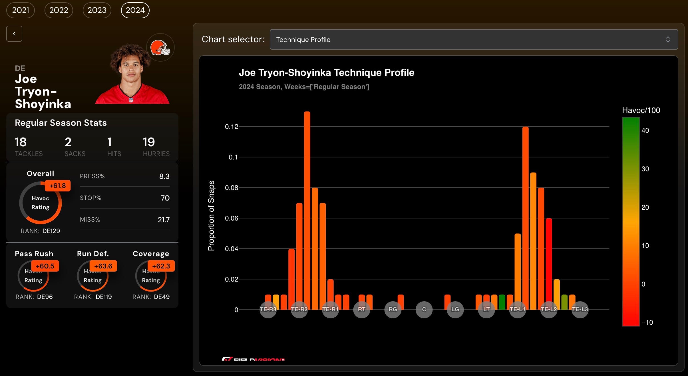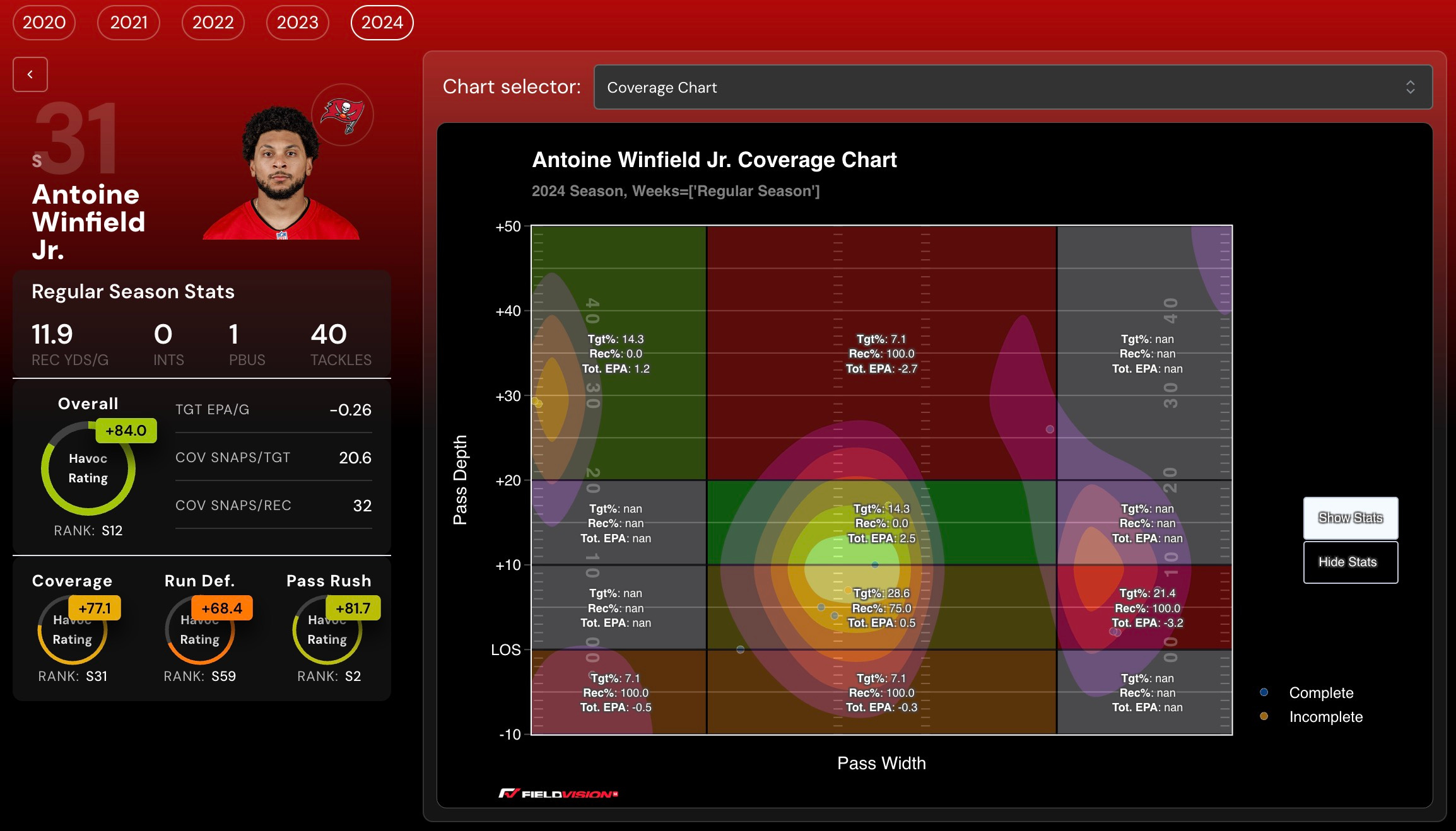 Head Coach Todd Bowles is still regarded as one of the best defensive minds in football. The veteran coach runs a zone and blitz-centric defense that uses pressure to force issues in the passing game. In ‘24, the defense played erratic, even with a relatively stable roster. The defense had inconsistent play from its Edges, linebackers, and the Safety opposite Antoine Winfield Jr. Tampa finished ninth in EPA/play versus the run last season, but 20th against dropback passes (no play-action).