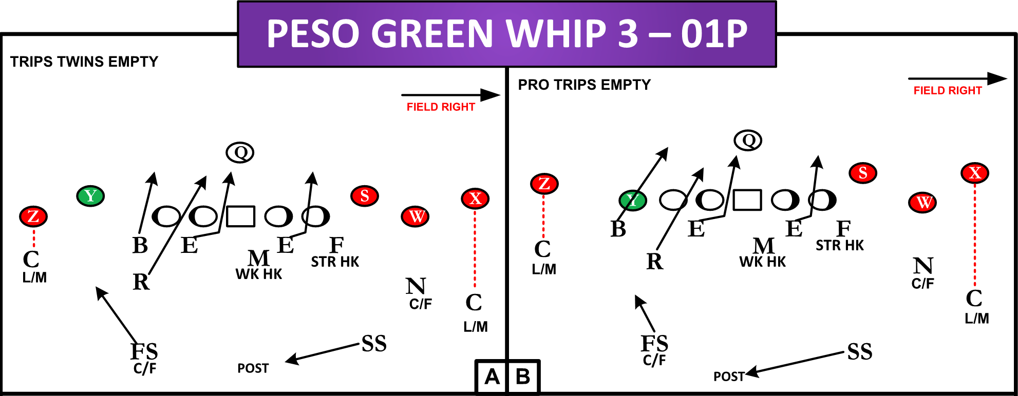 In the NFL, teams run WHIP but use a Fire Zone (3-under/3-Deep) concept behind it and use the EDGE as a “bonus” dropper to flood the “hot” areas of the box. Many times against pressure, QBs will look to quicker developing routes near the box to get rid of the ball. Placing an extra player in the zone allows the defense to combo Spot or Option routes near the box or even cut crossing routes as they work to the pass strength (flood the zone).