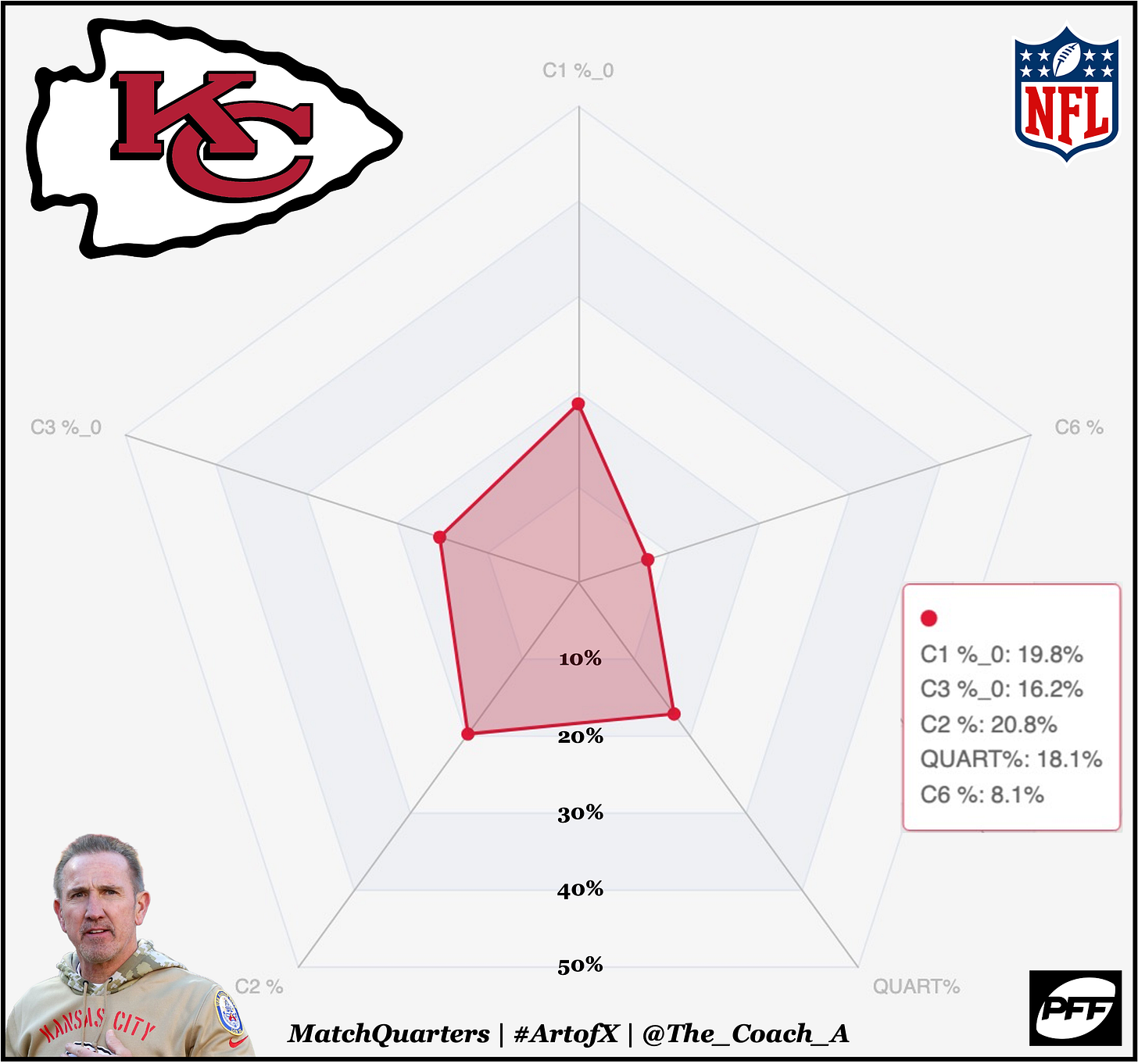 Defensive Coordinator Steve Spagnuolo has done a tremendous job in Kansas City. Tasked with being a DC on the other side of an elite offense, he has created a defense that leverages the talent given to him by the front office. The Chiefs run a majority of middle-of-the-field open (MOFO) coverages, which adds up to about 46% of their calls.