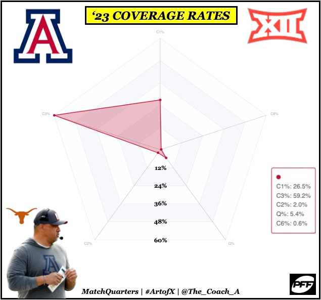 Arizona’s coverage chart is meme-like, with ~87% of its coverages run from a closed-post structure. In 2023, no other team ran Cover 3 more than the Wildcats. Nansen didn’t try to disguise it either, with a MOF Disguise rate of 7.7%, the lowest in the Power 5. Arizona paired their ‘static’ coverages with multiple fronts. In the back end, Nansen used Safety rotations depending on the opponent to alleviate issues in the backend and developed cut-off valves against offenses trying to exploit their closed-post coverages.