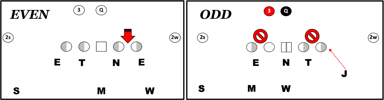 The Odd Front structure is probably the most popular form of defense in football because of its innate ability to be multiple. With technically five defenders attached to the line of scrimmage, a defense can use pressure and alignment to counter any offense. The Even Front’s rigidity forces it to have only a few basic switch-ups, typically changing the front strength or adjusting the Nose’s width (e.g., from a Shade to a 2 technique).